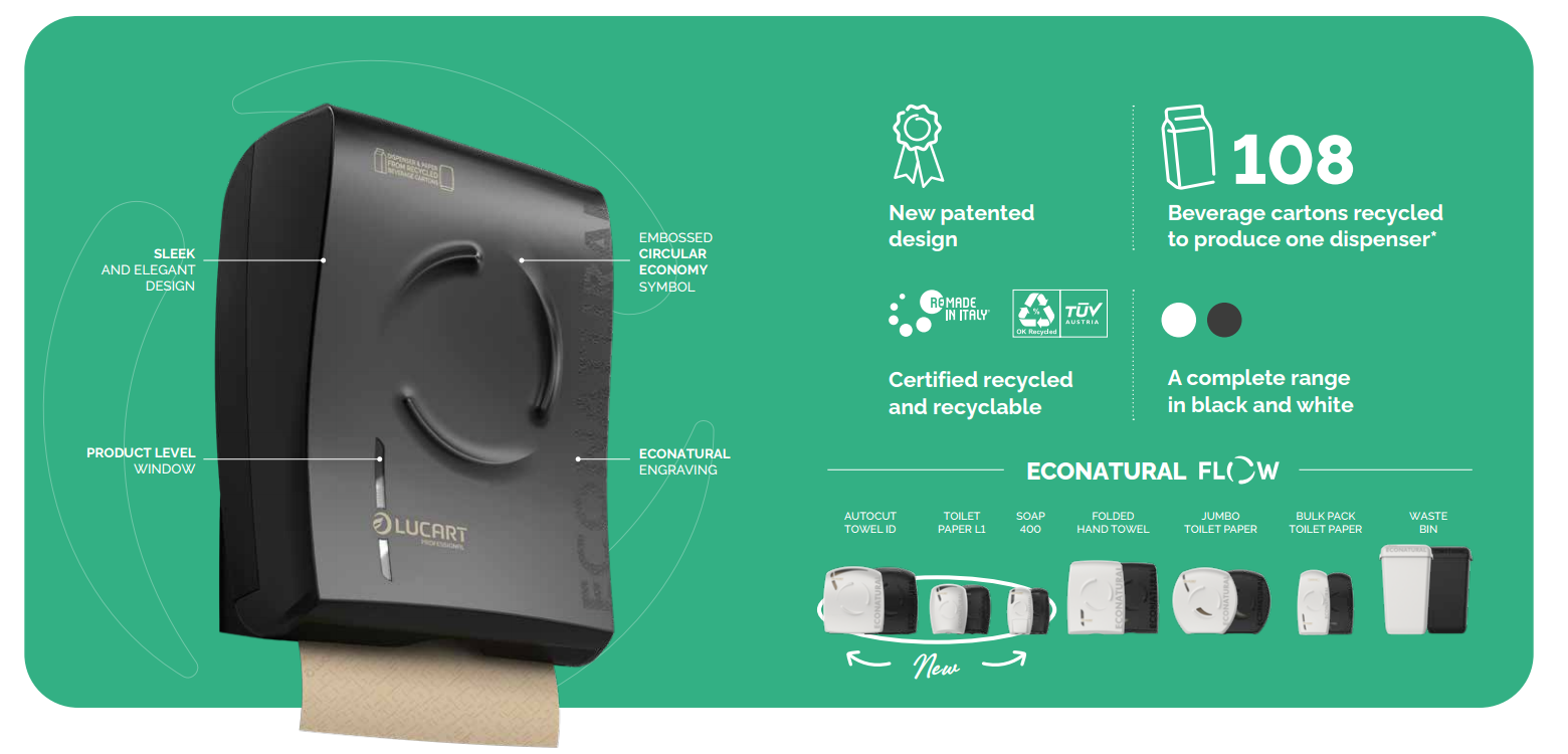 Manufactured from 108 recycled beverage cartons, the Econatural Flow range showcases Lucart’s pioneering circular economy approach — transforming cellulose fibres, polyethylene, and aluminium from used drink cartons into durable, elegant hygiene solutions. Available in black or white, the dispenser features a smooth, sleek profile with the signature embossed circular economy symbol and Econatural engraving, symbolising its 100% recycled heritage. A transparent viewing window provides quick visibility of tissue levels, ensuring efficient replenishment.