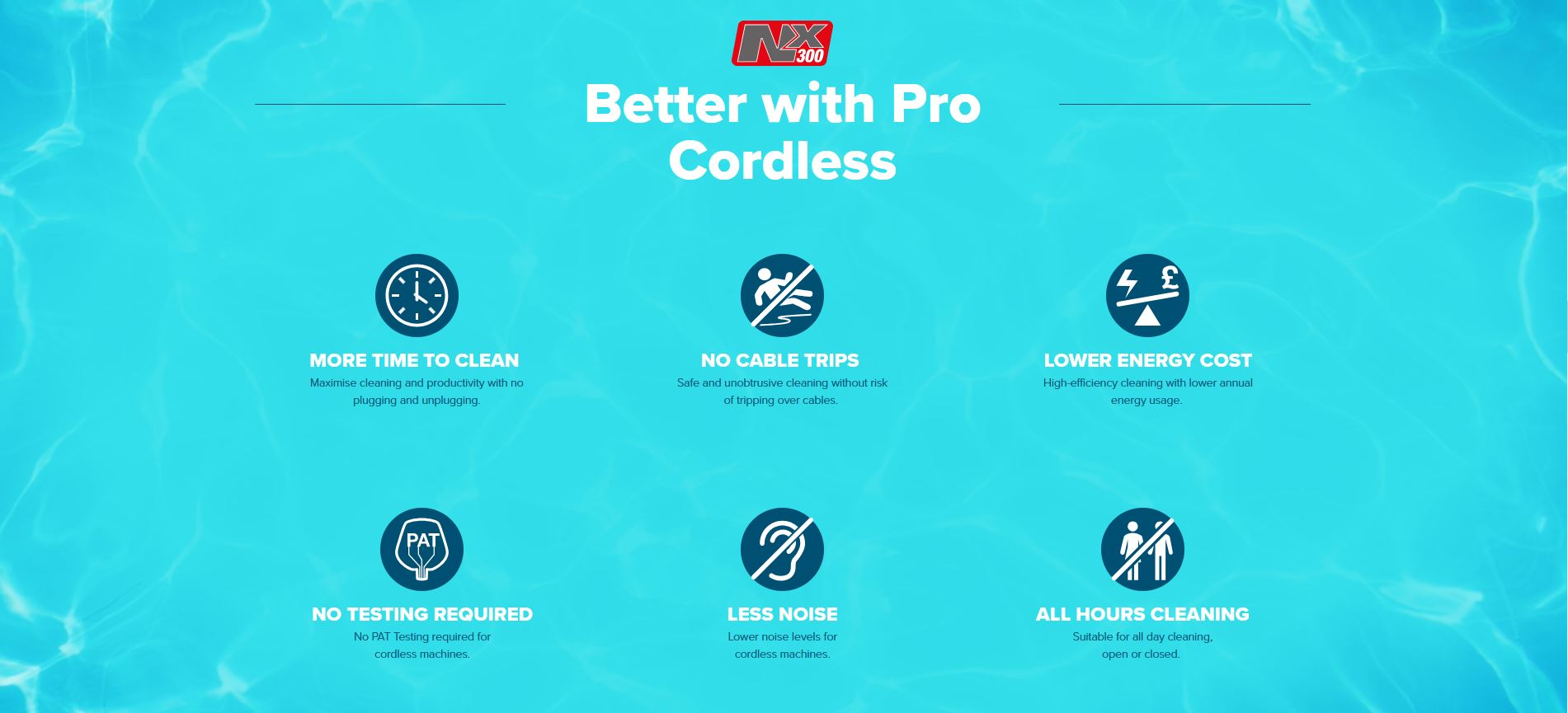 Powered by the advanced NX300 Pro Cordless System, the machine’s digital motor delivers exceptional suction and energy efficiency, providing extended runtime and consistent results every time. With no trailing cables, users eliminate the risk of slips, trips, and downtime—perfect for 24/7 cleaning in busy environments.