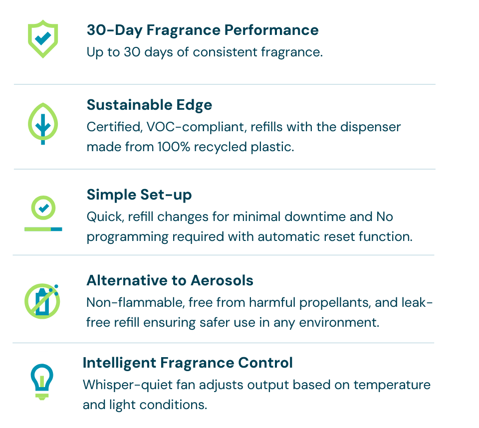 At the heart of the system is its sustainably designed dispenser, made from 100% post-consumer recycled plastic, helping businesses reduce their environmental impact. The refill cartridges are equally innovative, crafted with over 50% plant-based EVA material derived from sugarcane, and available in a range of long-lasting fragrances that provide up to 30 days of continuous freshness.