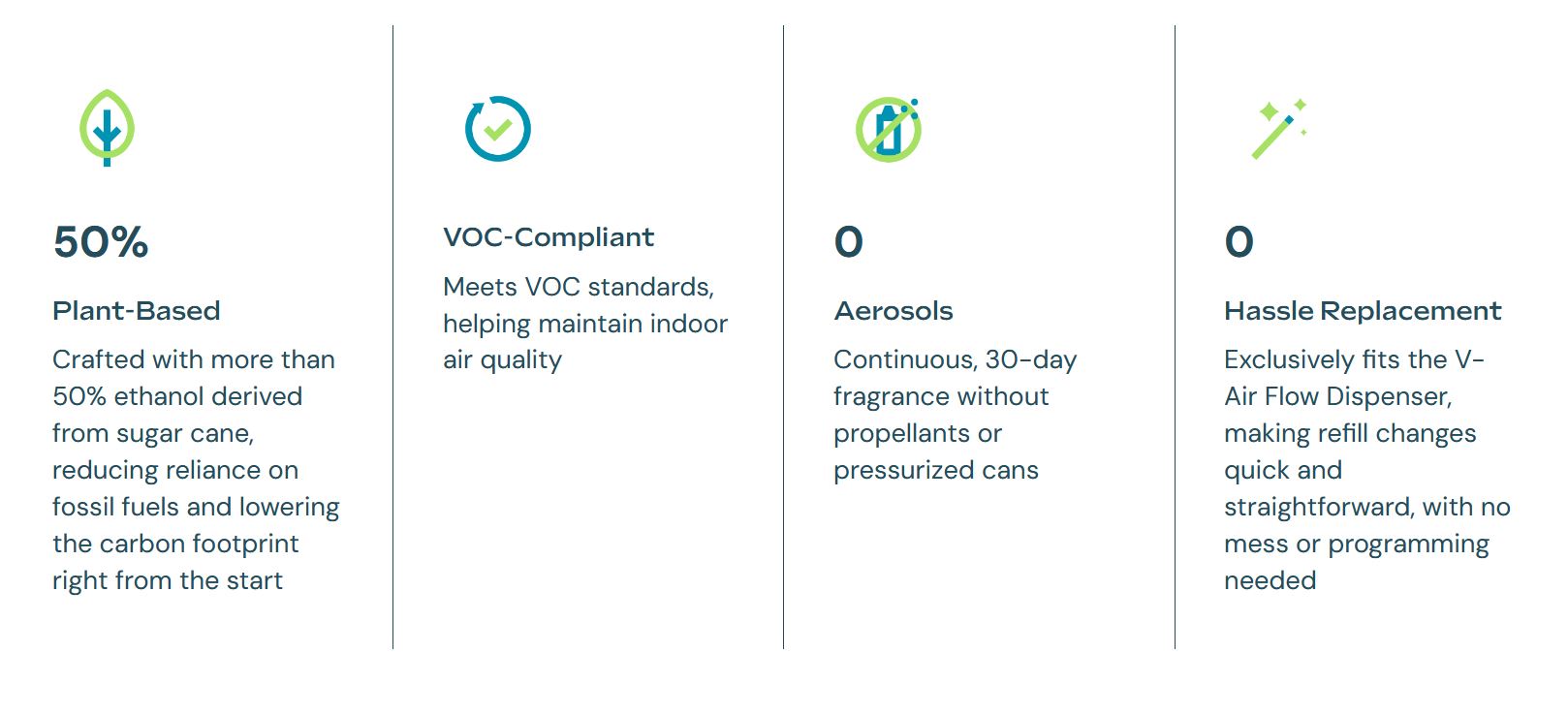 Vectair V-Air Flow Refills deliver sustainable 30-day aircare with over 50% plant-based ethanol. Designed for the V-Air Flow Dispenser, they provide consistent, non-aerosol fragrance release while supporting eco-concious initiative.