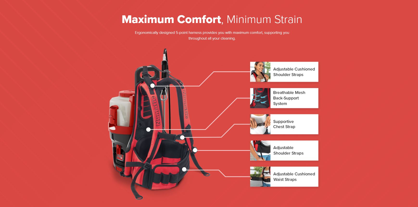 Designed for extended commercial use, the RSU150NX includes a fully adjustable 5-point harness with cushioned shoulder and waist straps for all-day comfort. A breathable mesh back support ensures continuous airflow, keeping the operator cool and comfortable during use.