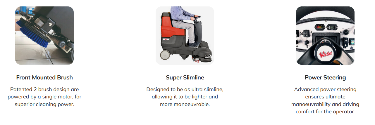 A compact ride-on scrubber dryer for tight spaces, the Victor SDR-80 combines walk-behind manoeuvrability with ride-on productivity, featuring a front-mounted twin-brush head, power steering, quick maintenance access and safer drying with the squeegee ahead of the wheels.
