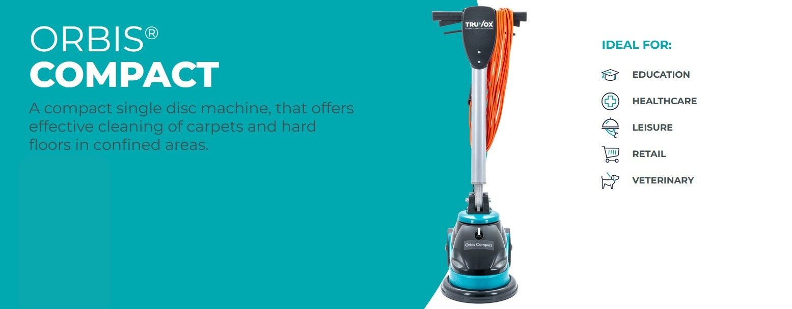 The Orbis® Compact is a lightweight and highly manoeuvrable single-disc rotary floor machine, designed for professional cleaning and maintenance in confined or congested areas. Weighing only 22 kg and featuring a 28 cm brush or pad diameter, it delivers powerful, controlled cleaning performance on both carpets and hard floors where larger machines cannot reach.